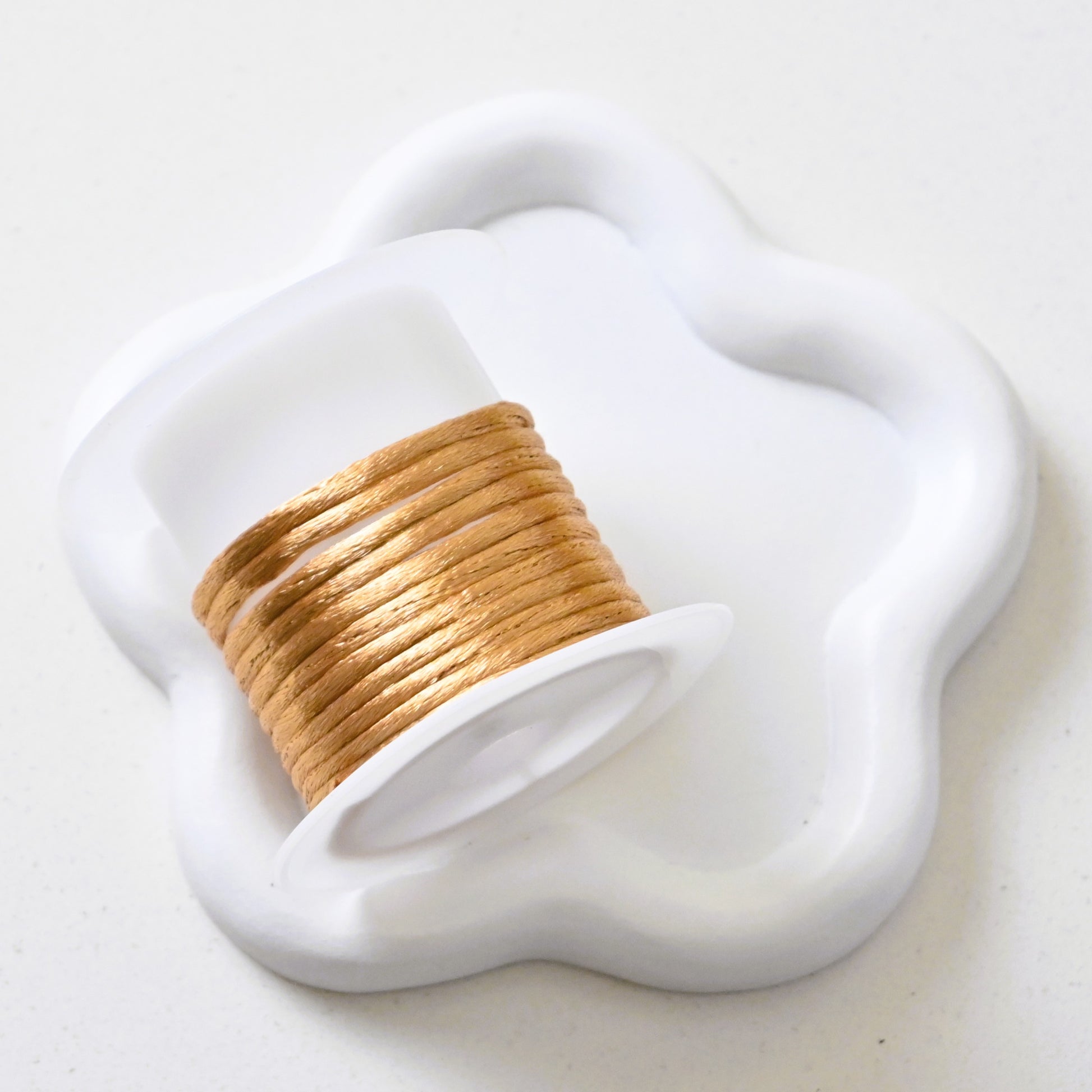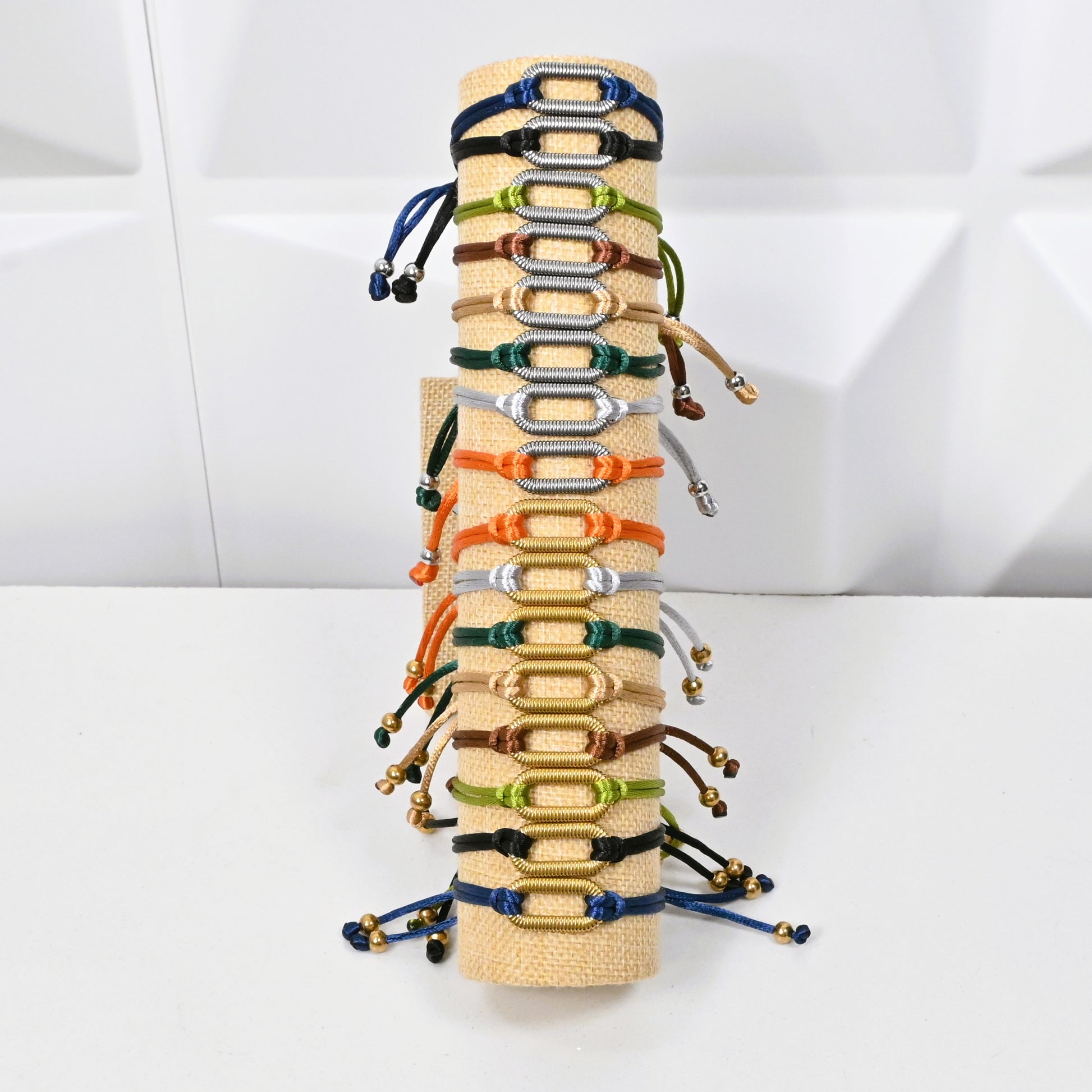 Una delicada obra hecha a mano que combina el brillo sutil del hilo satinado con la elegancia del conector tipo spring, disponible en acabado oro o plateado. Cada pulsera es elaborada por encargo, permitiéndote seleccionar entre una gran variedad de colores para reflejar tu estilo o contar tu historia.