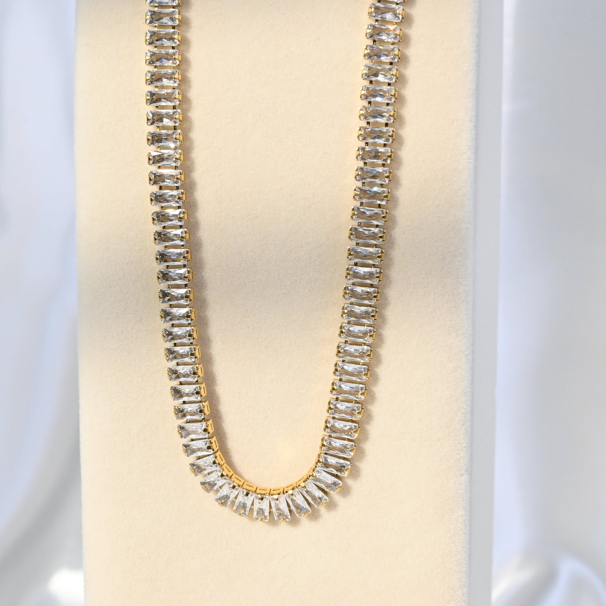La cadena tipo Tassel es un accesorio sofisticado que combina movimiento y brillo. Su diseño incorpora delicados detalles en zirconia, que capturan la luz con cada gesto, junto a una fina cadena en stainless steel enchapado en oro. Una pieza elegante y versátil, ideal para añadir un toque de distinción.