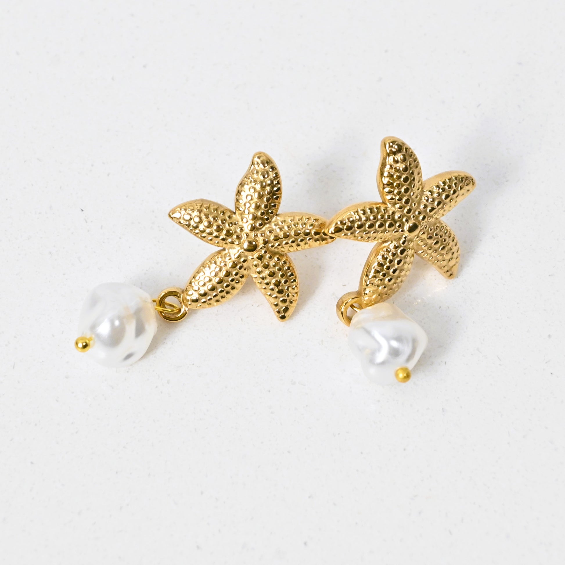 Elegant and lightweight, our stainless steel earrings with an imitation pearl offer a subtle shine that’s perfect for beach style. Designed as a charming star with a delicate dangling pearl, they bring a feminine, fresh, and versatile touch to any look.