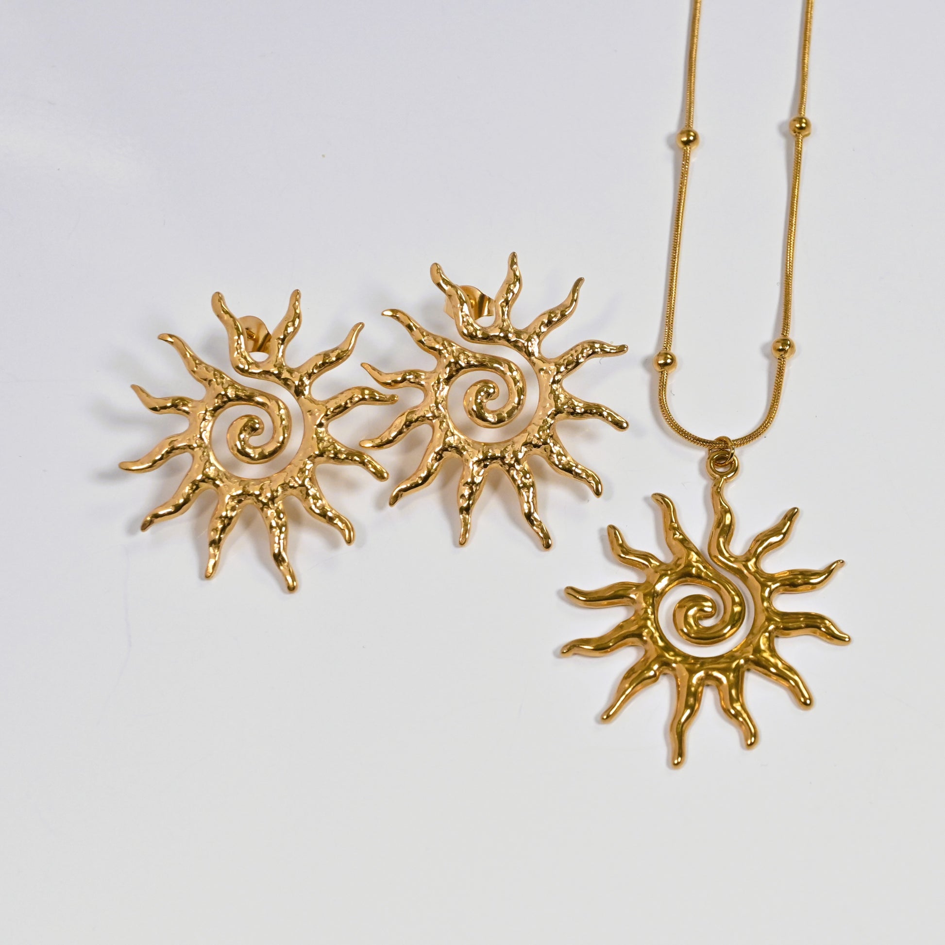 The I Need Sun Necklace and earrings captures the essence of the Caribbean’s blazing sun. This delicate gold-plated stainless steel chain features a sun-shaped pendant, symbolizing energy, warmth, and vitality. In addition, to the pair of earrings. A luminous and elegant piece, perfect for adding a touch of joy and style to your everyday look.