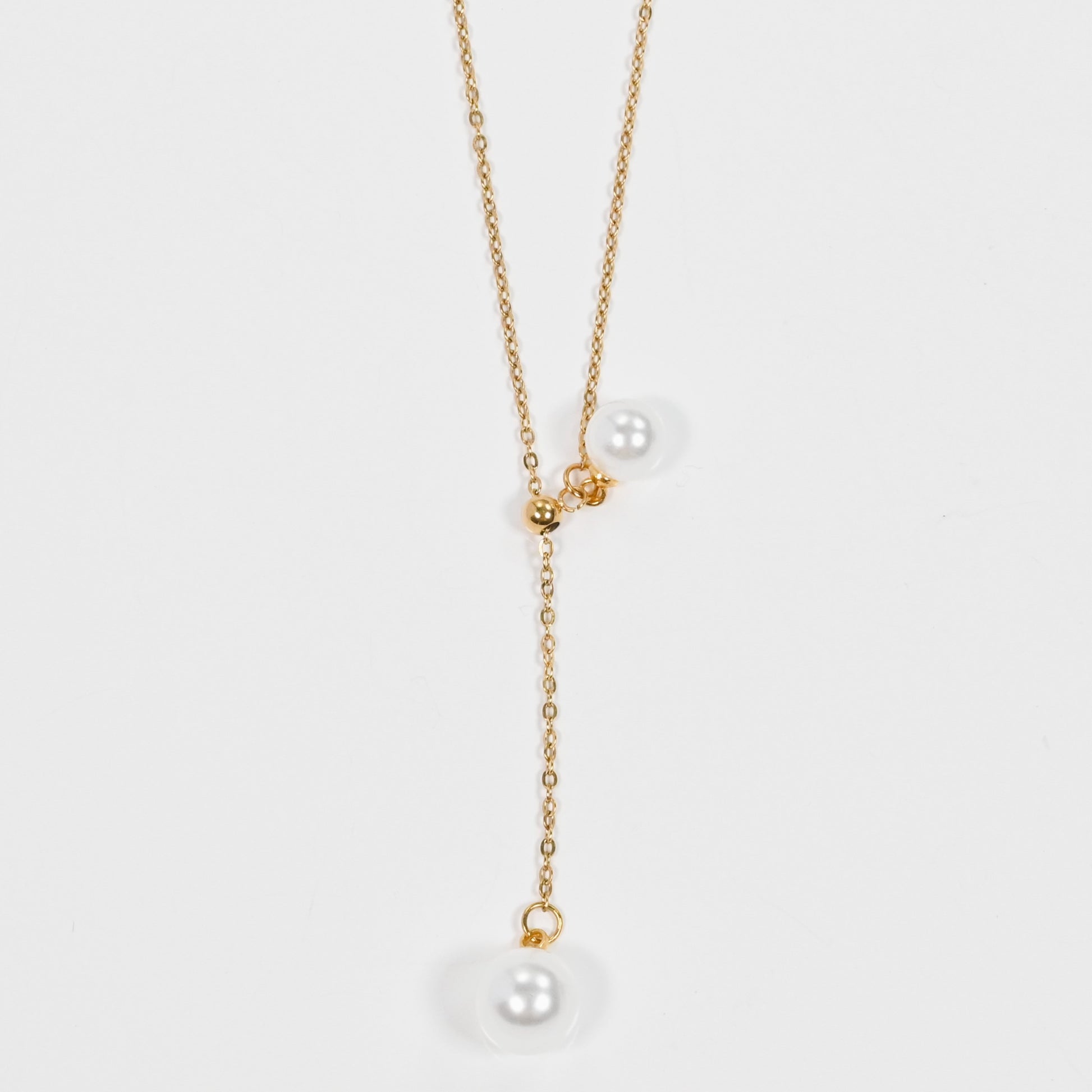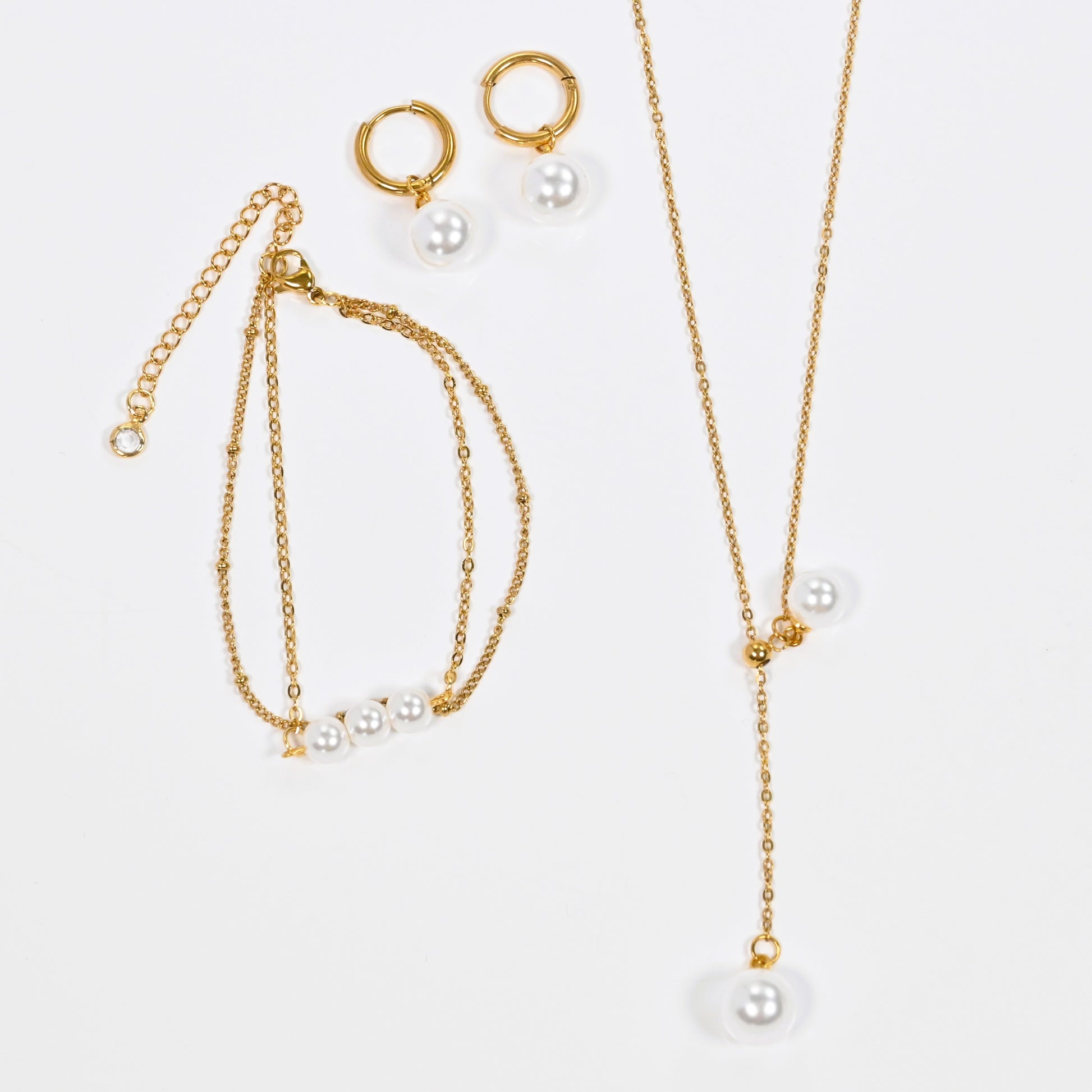A minimalist yet refined design. This necklace, with the bracelet and earrings in combination, features a delicate gold-plated stainless steel chain with two pearls linked together, hanging at different lengths to create a sleek and elegant effect. A versatile piece that elevates any outfit with timeless sophistication.