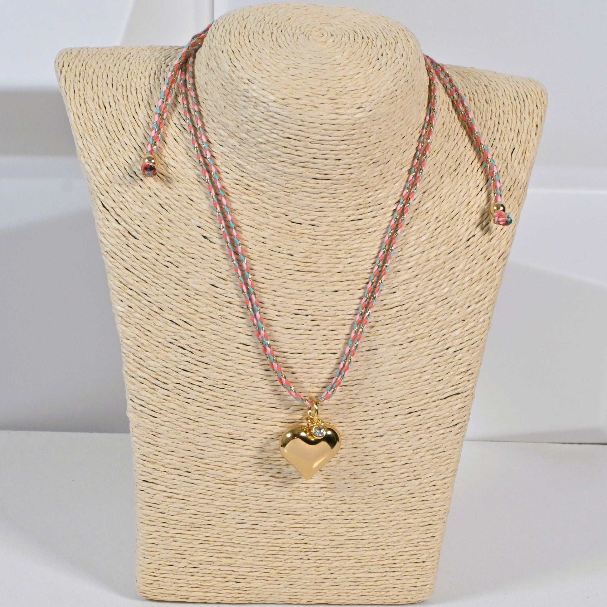 Confeccionada a mano en hilo con suaves tonalidades que combinan con facilidad, el collar Latido Dorado incorpora un charm en forma de corazón en stainless steel enchapado en oro y un pequeño dije de zirconia que refleja tu brillo interior.