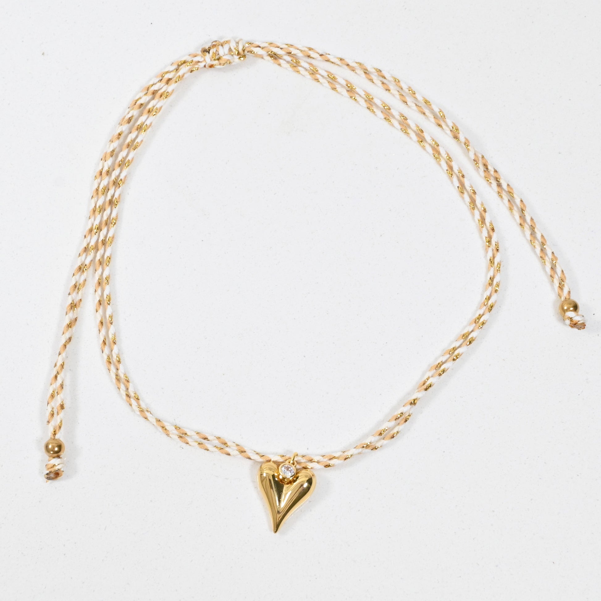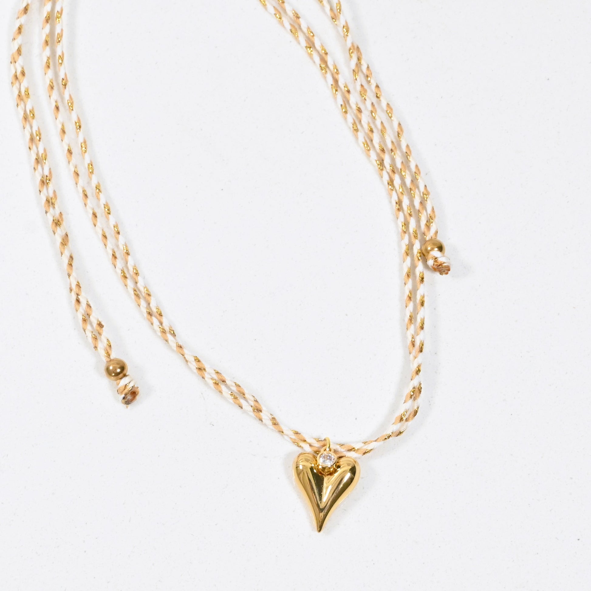 Confeccionada a mano en hilo con suaves tonalidades que combinan con facilidad, el collar Latido Dorado incorpora un charm en forma de corazón en stainless steel enchapado en oro y un pequeño dije de zirconia que refleja tu brillo interior.