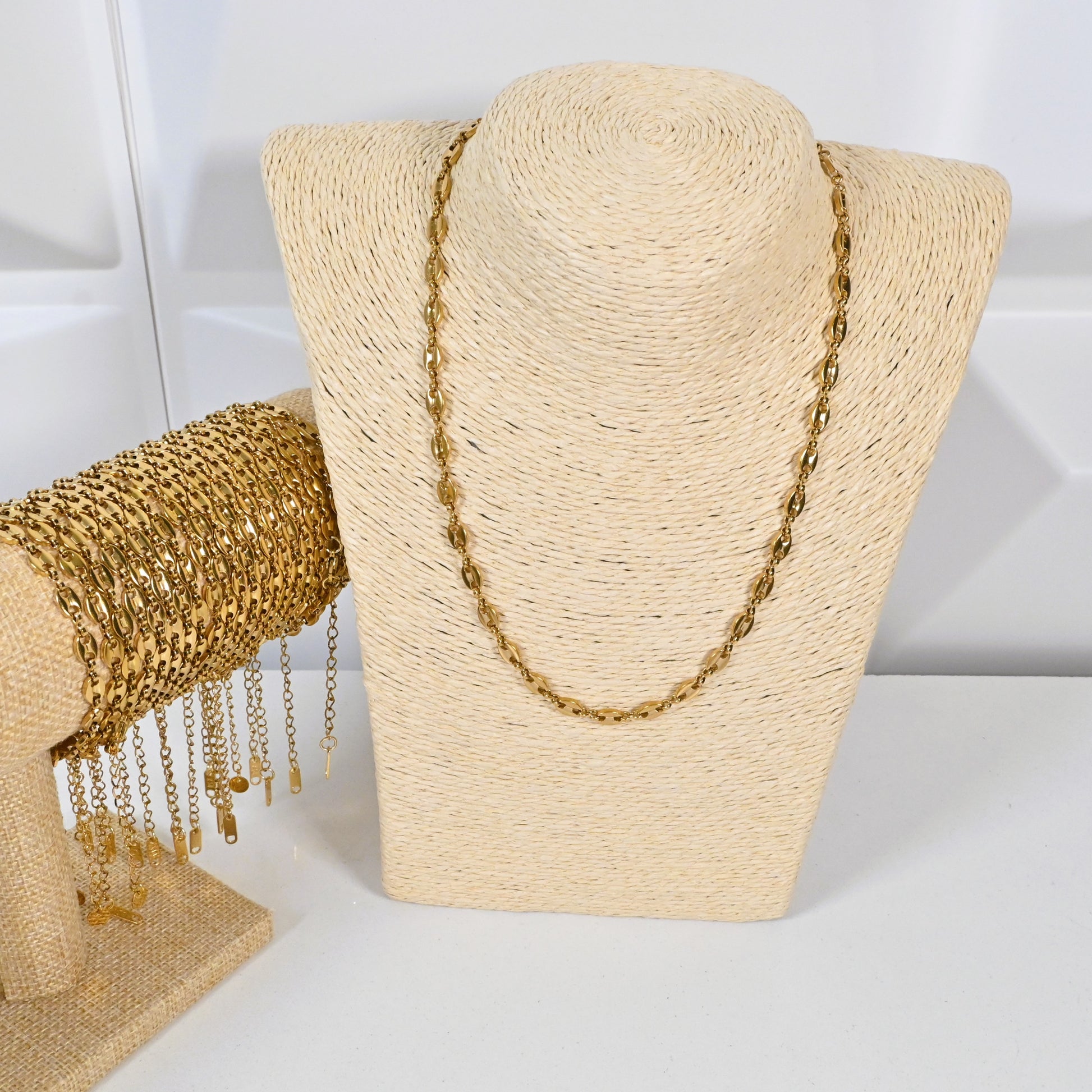 Esta cadena de eslabones en stainless steel enchapada en oro es tan versátil como elegante. Su diseño clásico la convierte en la pieza perfecta para combinar con cualquier otro tipo de cadena o lucirla sola para un toque minimalista.