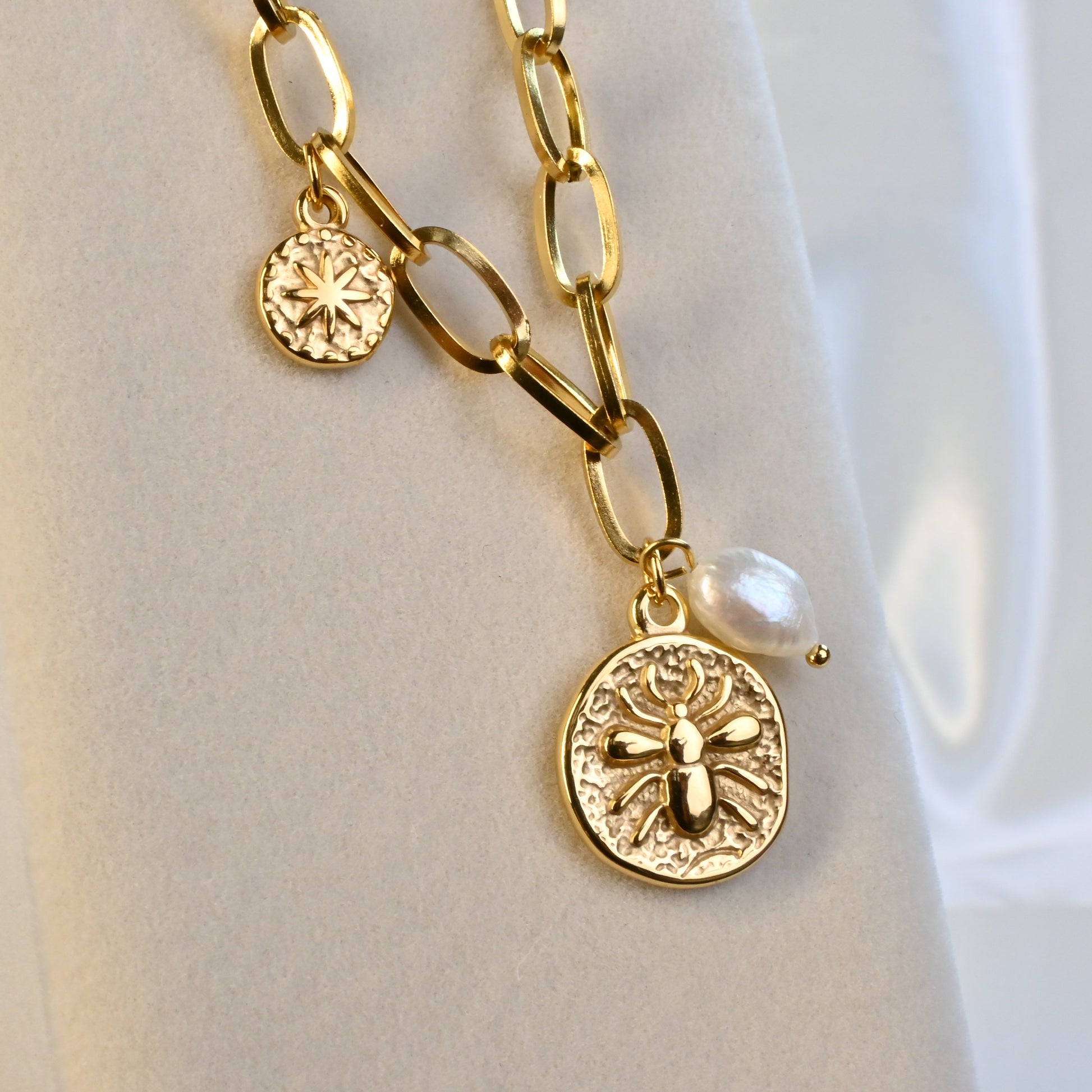 A unique piece that blends nature and whimsy. This gold-plated stainless steel chain features a pendant with an ant image, complemented by a fantasy pearl and a tiny starfish, creating a charming and detailed design. Perfect for those seeking a fun, original accessory full of personality.