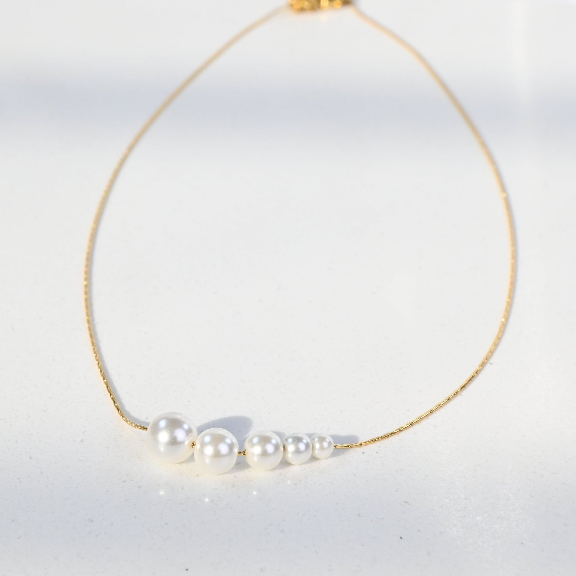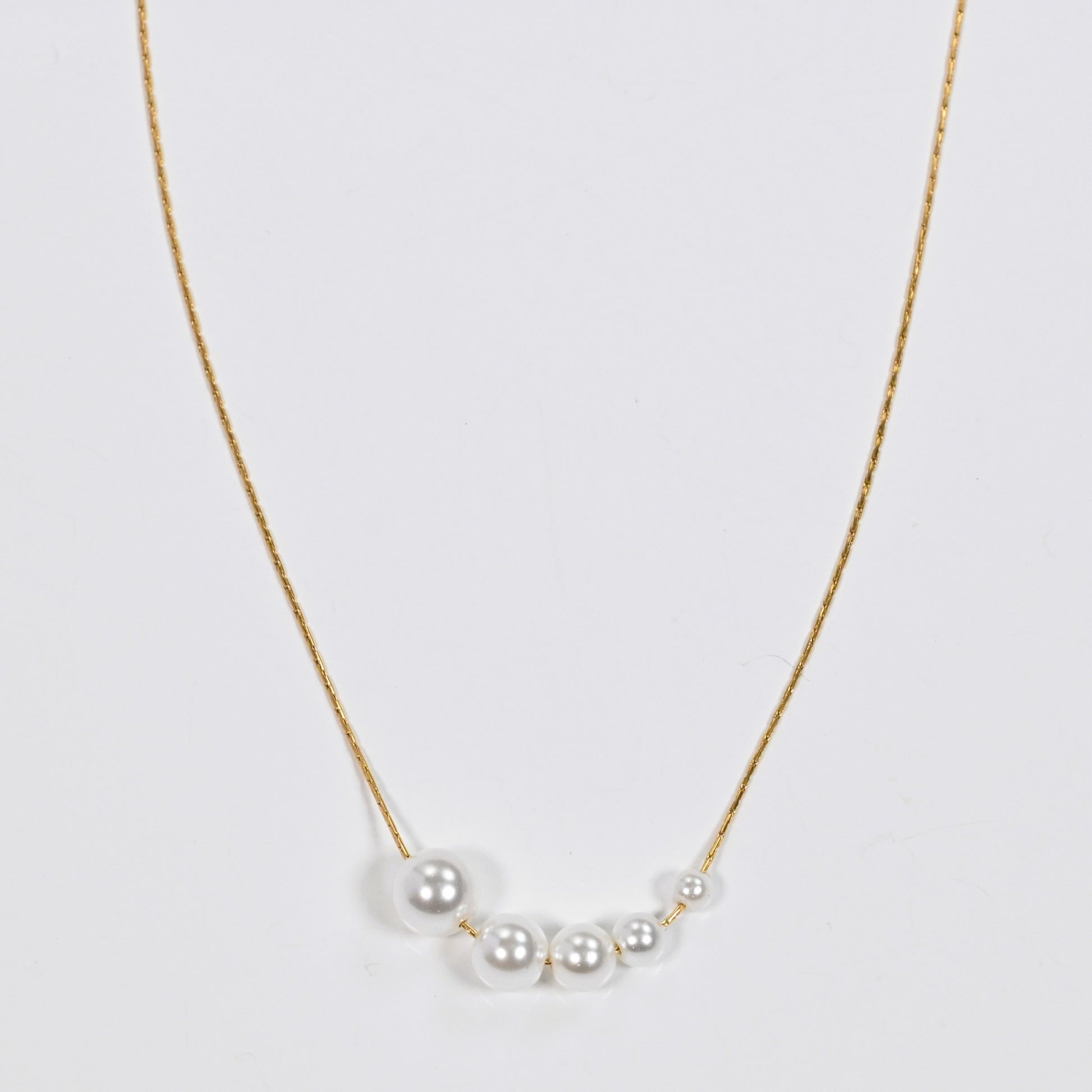The Tamara necklace embodies subtle elegance and femininity. Its design features five imitation pearls arranged in ascending size, creating a harmonious and sophisticated effect. Completed with a delicate gold-plated stainless steel chain, this piece is perfect to elevate any look with both classic and modern charm.
